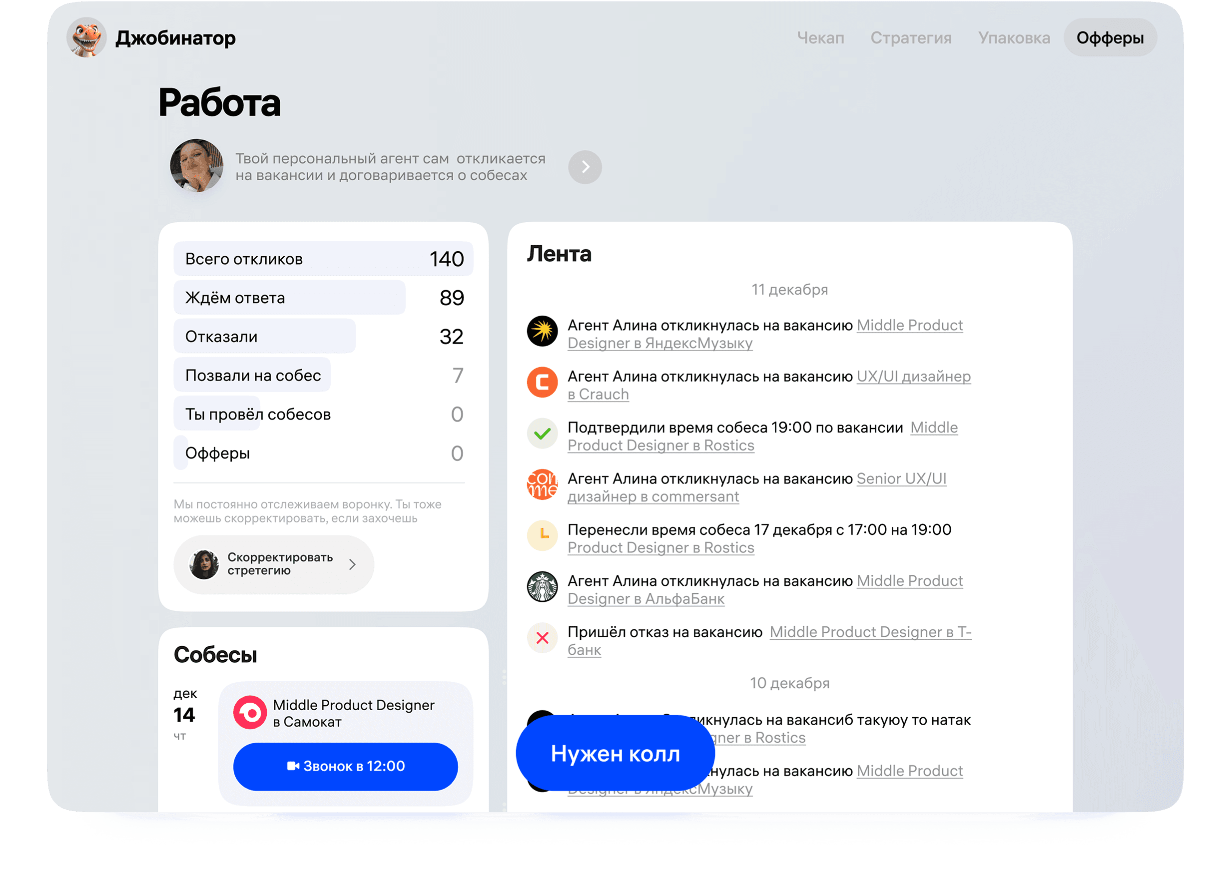 Запроектировал и нарисовал экраны для полного цикла трудоустройства юзеров. От первичного скоринга до воронки откликов.